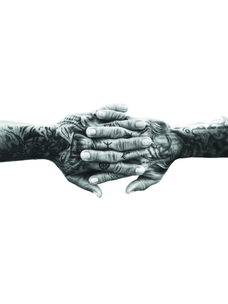 The charcoal drawings “Bromance” and “Hands” reflect upon a burgeoning need for emotional connection and bonding between men and increased acceptance of non traditional male friendships. These images hopefully indicate the potential for men to change, to open up, to empathise and to feel.