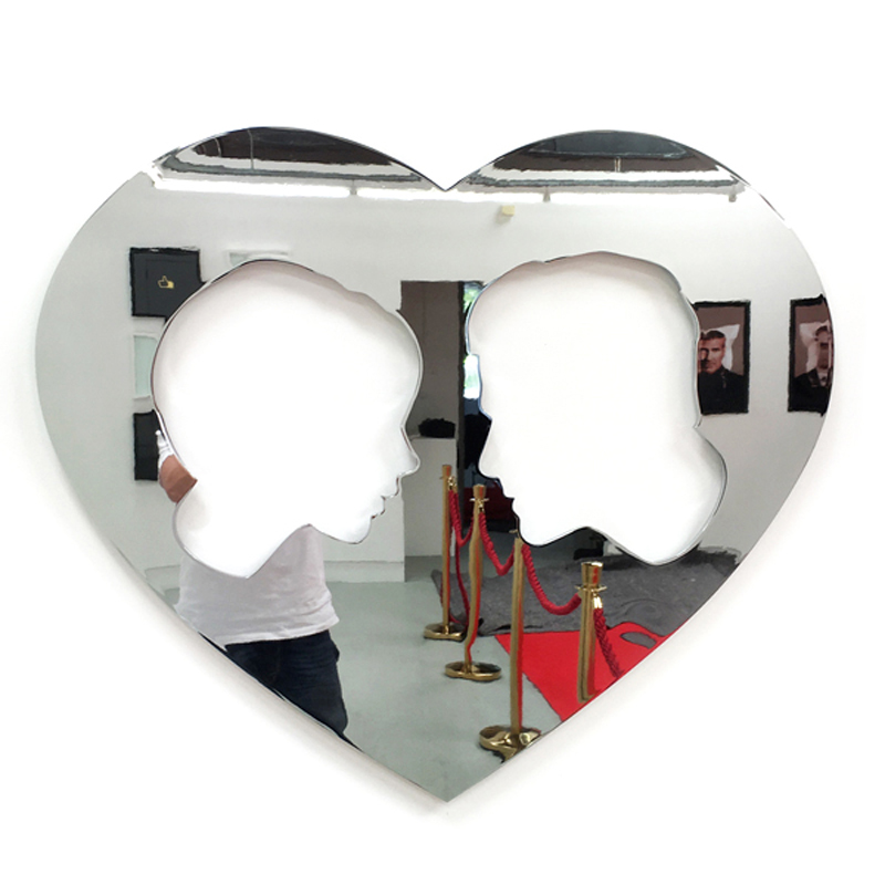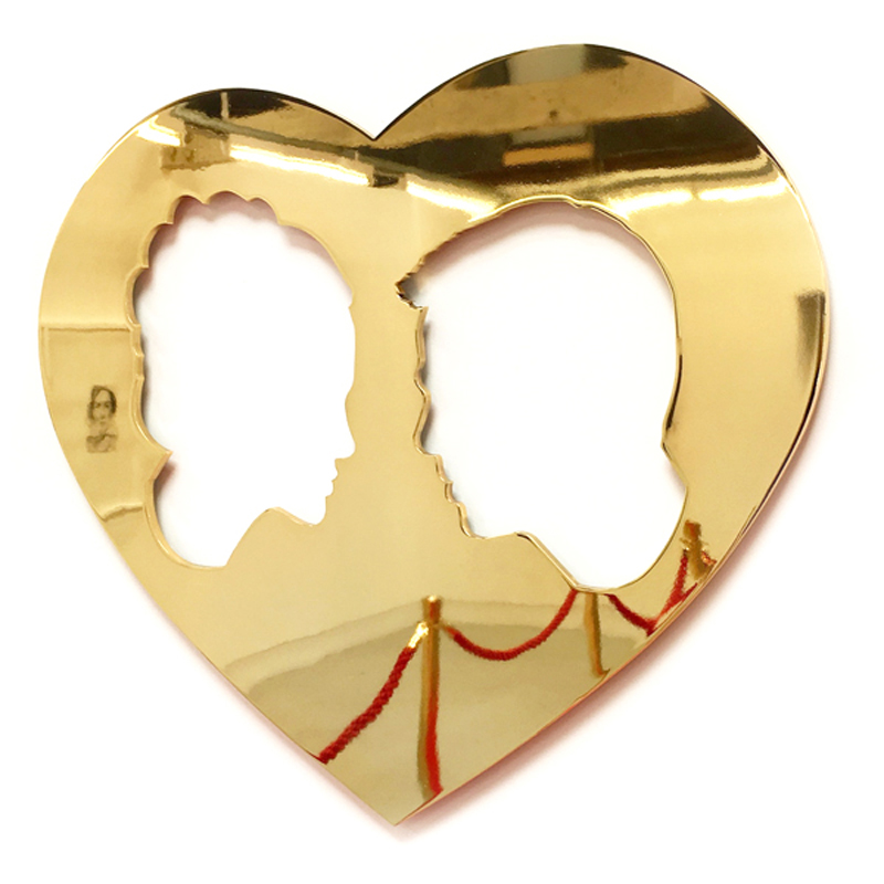 The #Powercouple Series of “Brangelina”, “Posh and Becks” and “Kimye” respectively Brad Pitt and Angelina Jolie, David and Victoria Beckham, Kim Kardashian and Kanye West are represented in profile enclosed within a shiny, glossy, alluring love heart shape. However the veneer and gloss is two dimensional, their floating heads alluding to coinage and by implication monetary value. They appear as branded logos to be sold to the highest bidder and their mirror finish reflects the viewers acquiescence in this process.