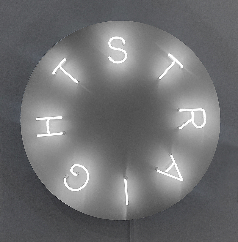 The work “STRAIGHT” is comprised of a white Neon, 120 cm in diameter. The word “STRAIGHT” however is spelt in a circular form, indicating that the perception of heteronormativity has shifted irrevocably away from being the centre to which all other gender identities are othered, to being itself an identity on a diverse spectrum. The work represents visually the seismic shift in gender identity and expression occurring today.