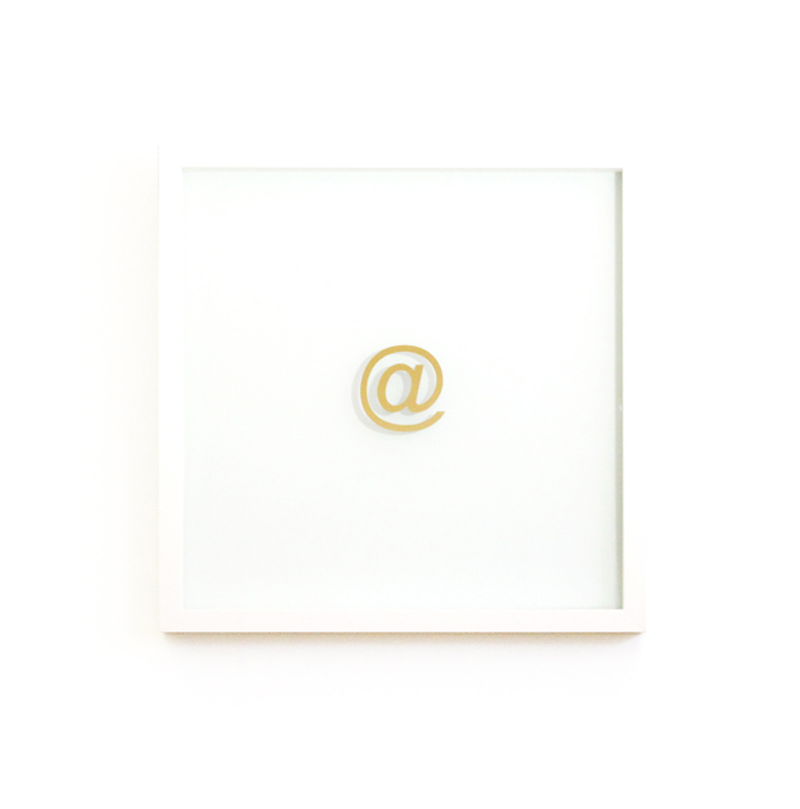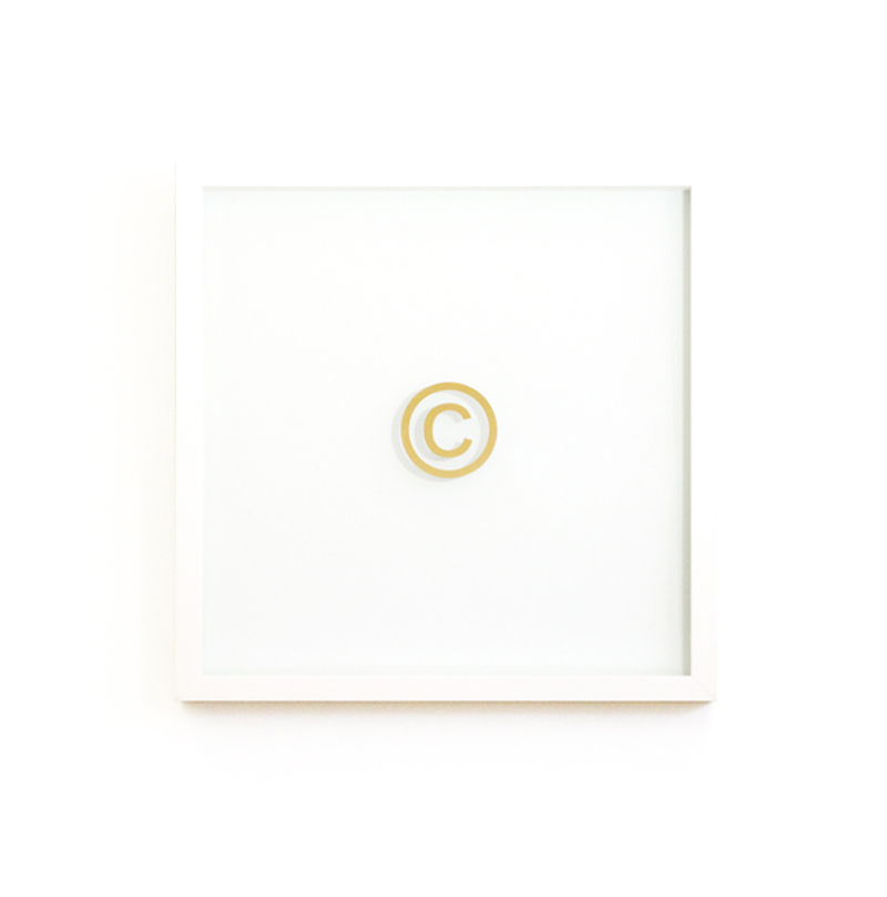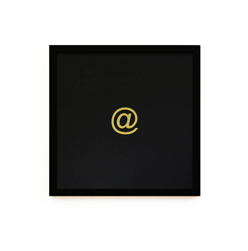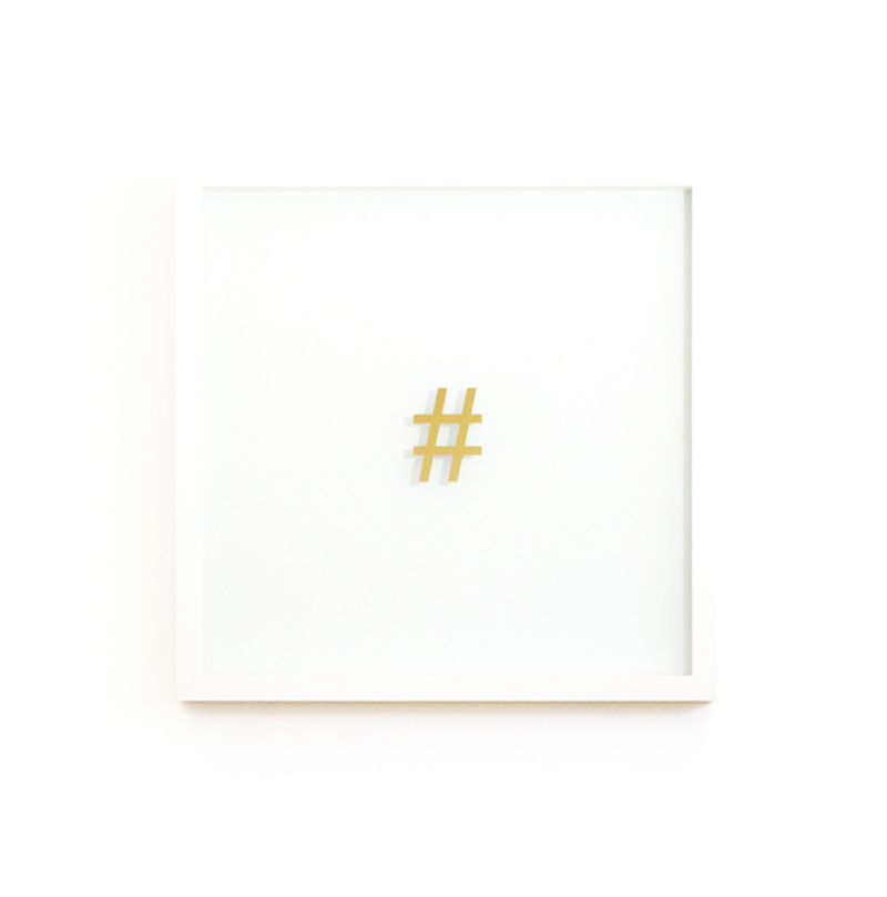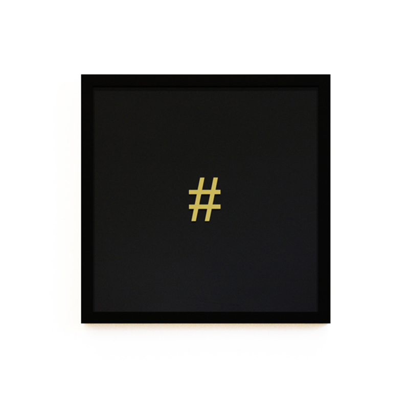 The Symbols series explores the language and use of symbols by advertising. The series examines the traditional symbols of ownership and branding with the Copyright, Trademark and Registration symbols and the newer internet based symbols of the Hashtag, @ and Like symbols. On the internet advertising collates the number of Likes, Shares and Hashtags the consumer clicks and uses this information to target audiences, discover what is popular and ultimately co-opt the consumer into advertising their products for them. In the series the Symbols are presented in 23 Carat Gold leaf framed in glossy frames acknowledging the reverence and monetary value that they import.