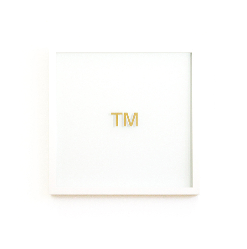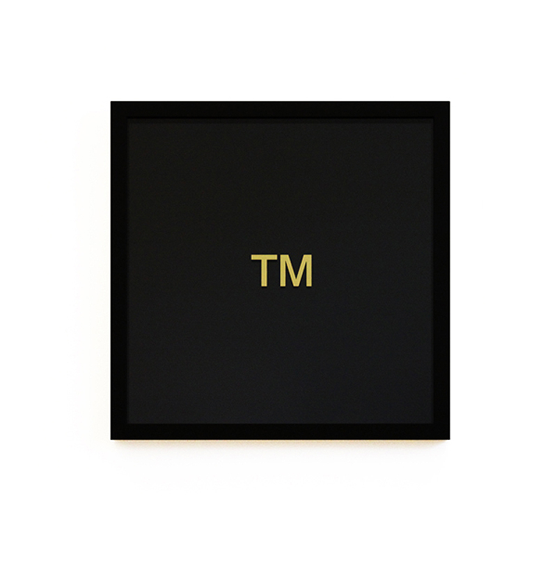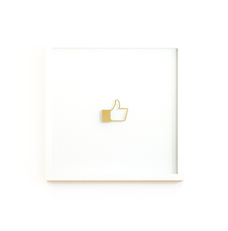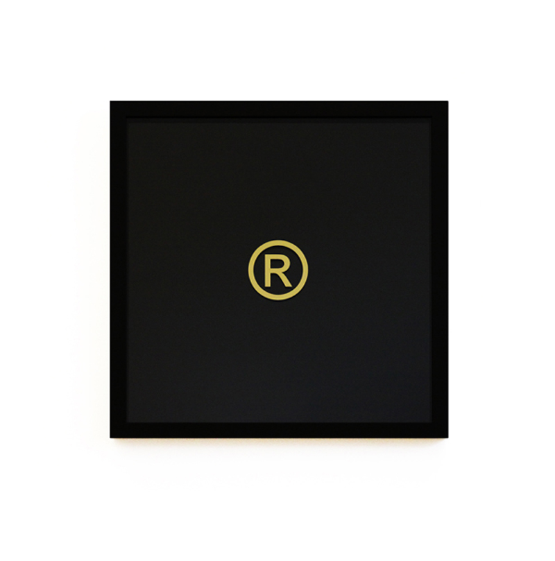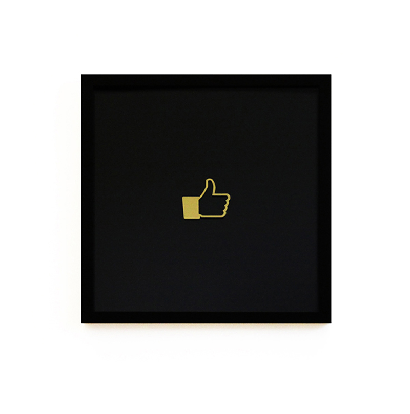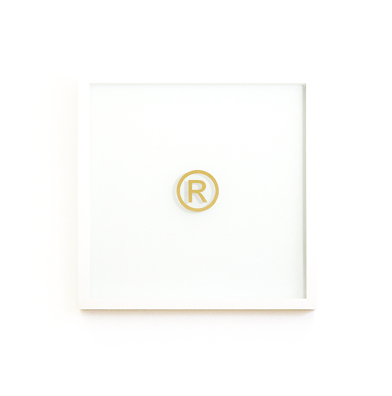The Symbols series explores the language and use of symbols by advertising. The series examines the traditional symbols of ownership and branding with the Copyright, Trademark and Registration symbols and the newer internet based symbols of the Hashtag, @ and Like symbols. On the internet advertising collates the number of Likes, Shares and Hashtags the consumer clicks and uses this information to target audiences, discover what is popular and ultimately co-opt the consumer into advertising their products for them. In the series the Symbols are presented in 23 Carat Gold leaf framed in glossy frames acknowledging the reverence and monetary value that they import.